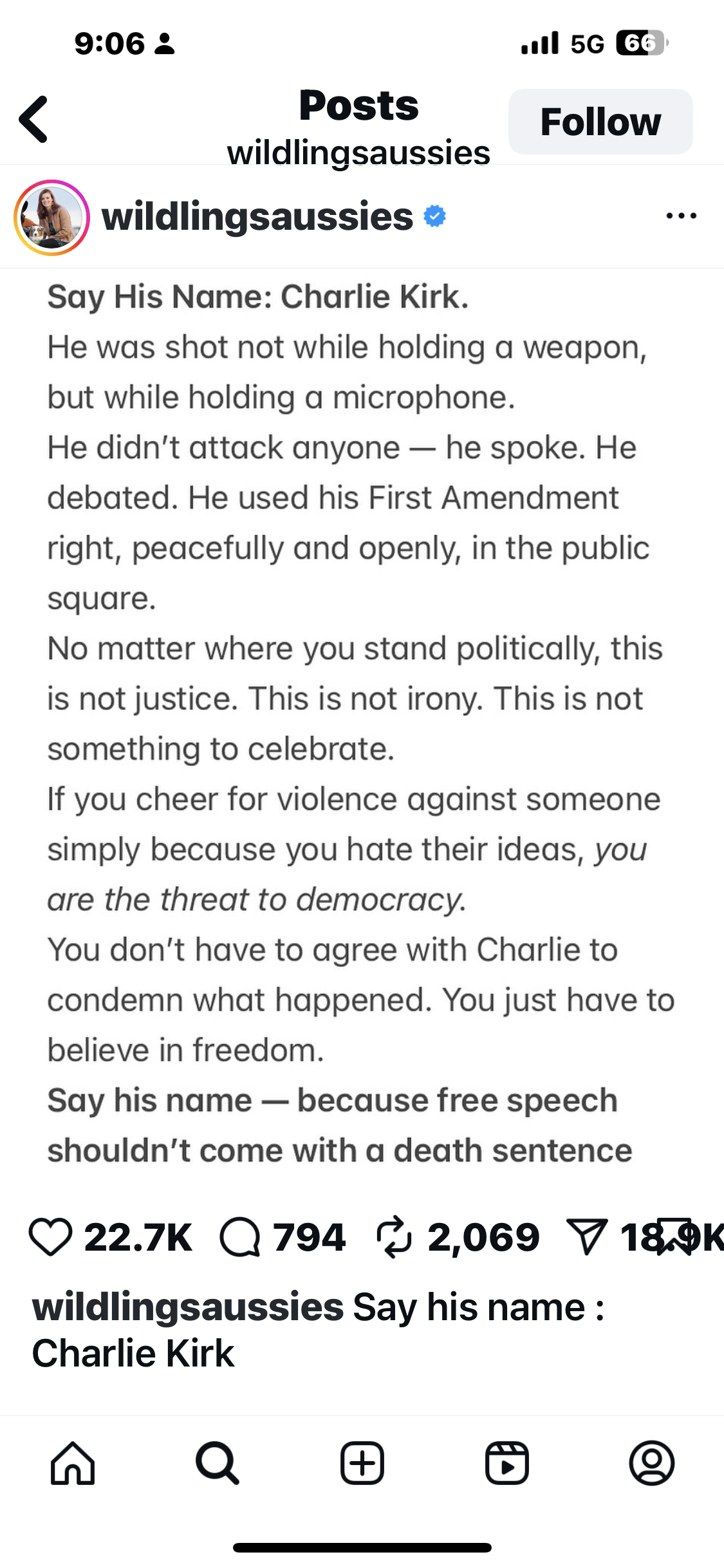 “This isn’t a political post. This is an America post… People are so brainwashed that they’ve forgotten common human decency. What kind of animal cheers the assassination attempt on someone who has different ideas than them? Even if you don’t agree with him, it’s his right to share his views just as it’s your right to share yours. Neither opinion warrants violence.”